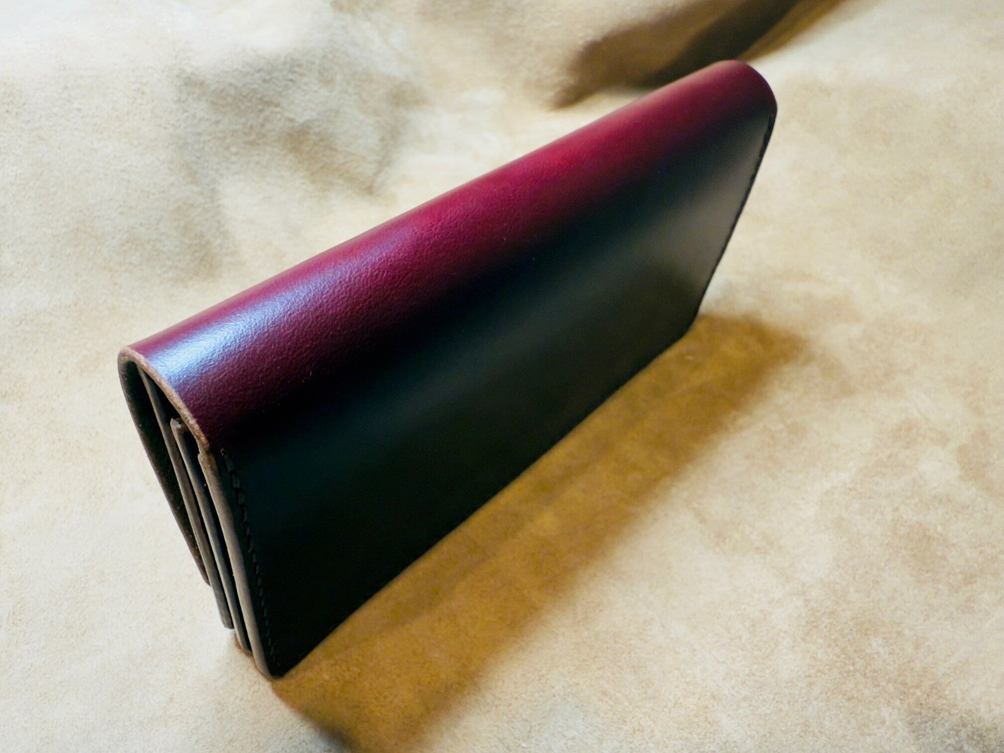 クロムエクセルレザーで有名なのはブラックの茶芯ですが、こちらのバーガンディーは色合いもカッコよく、曲げるとプルアップと言われる中の油分が左右に逃げることによって生まれる色の変化が特徴となります。真っ直ぐに直して撫でてあげれば元に戻りますので、ご安心ください。