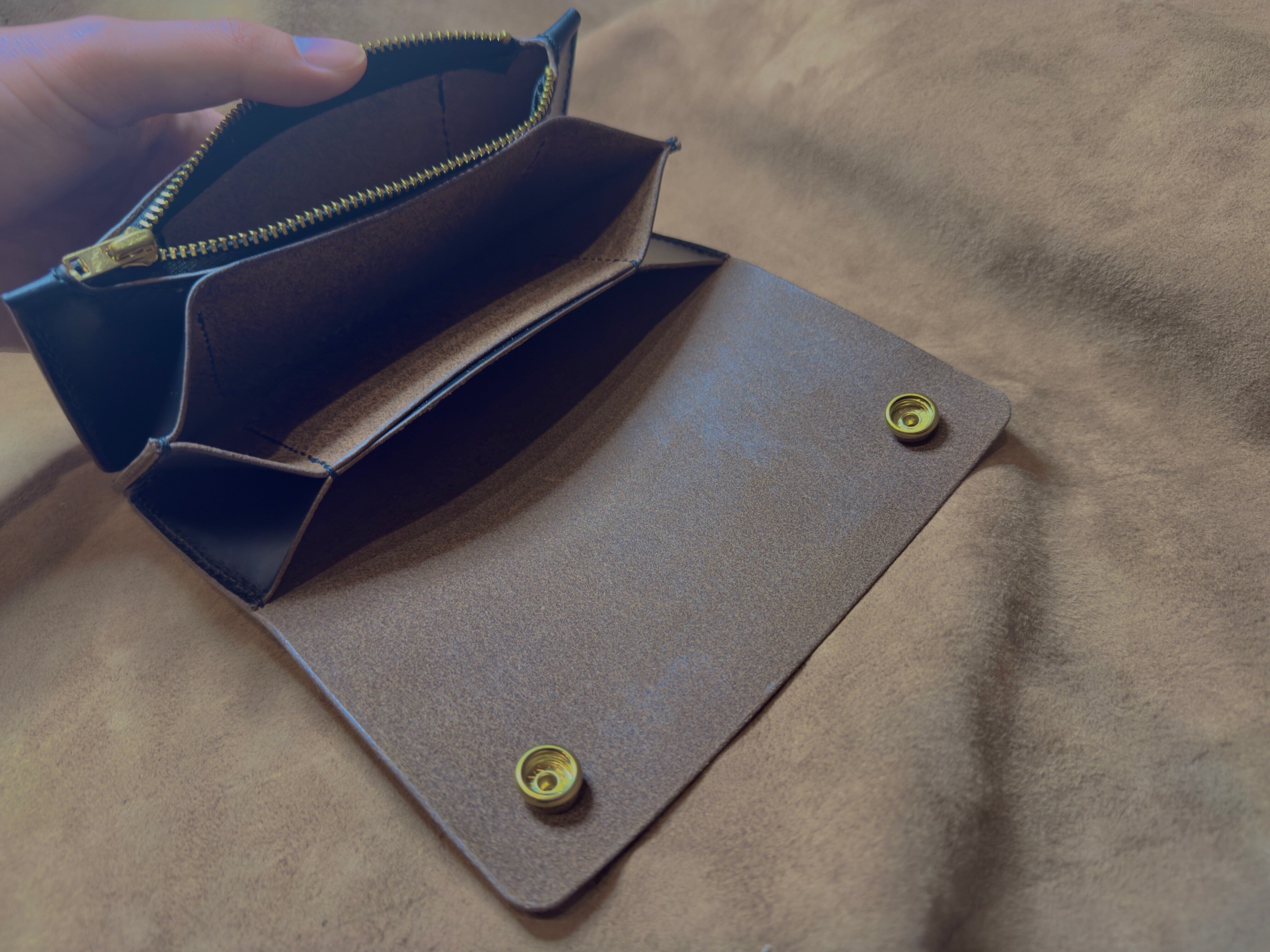 使用したのは、芯まで染めない伝統的な「茶芯」仕様のレザー。使い込むほどに表面の黒が擦れ、中から渋い茶色が顔を出します。傷さえも、あなたと歩んだ歴史として「味」に変わる。それがこの財布の完成形です。