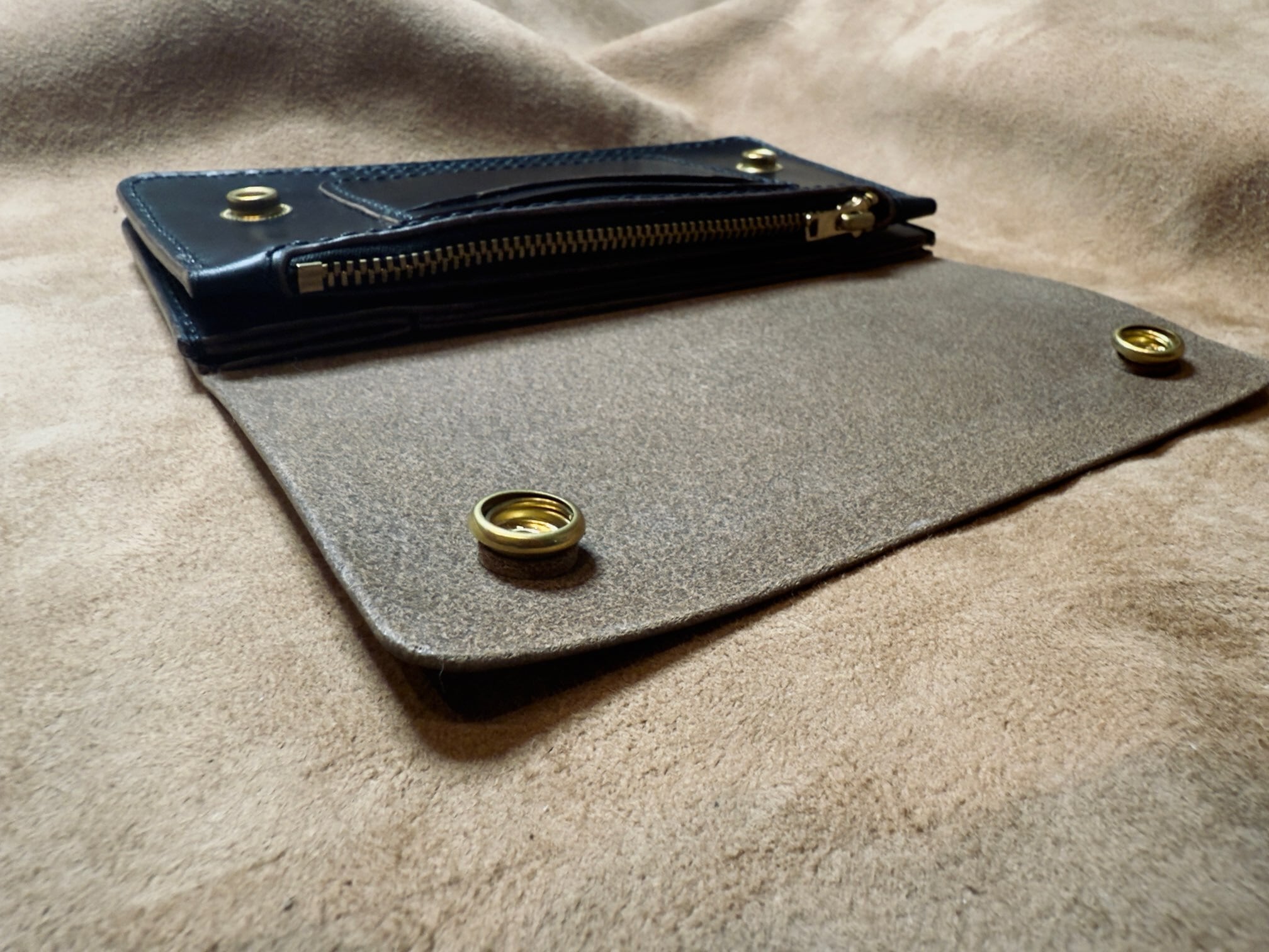 1960〜70年代のヴィンテージを象徴する真鍮製タロンの復刻版を採用。あの独特の重厚な開閉音と、経年変化する真鍮の輝きが、財布に圧倒的なリアリティを与えます。