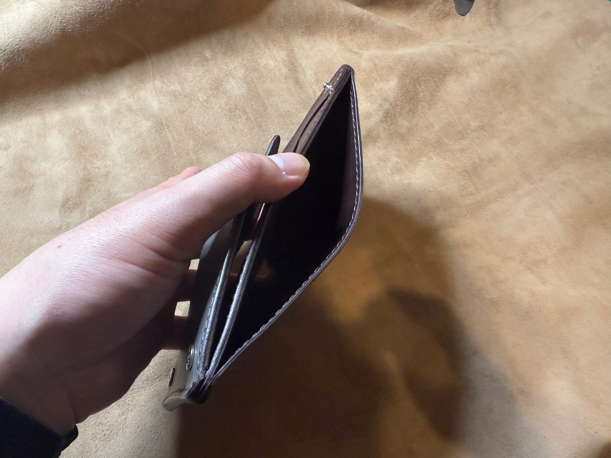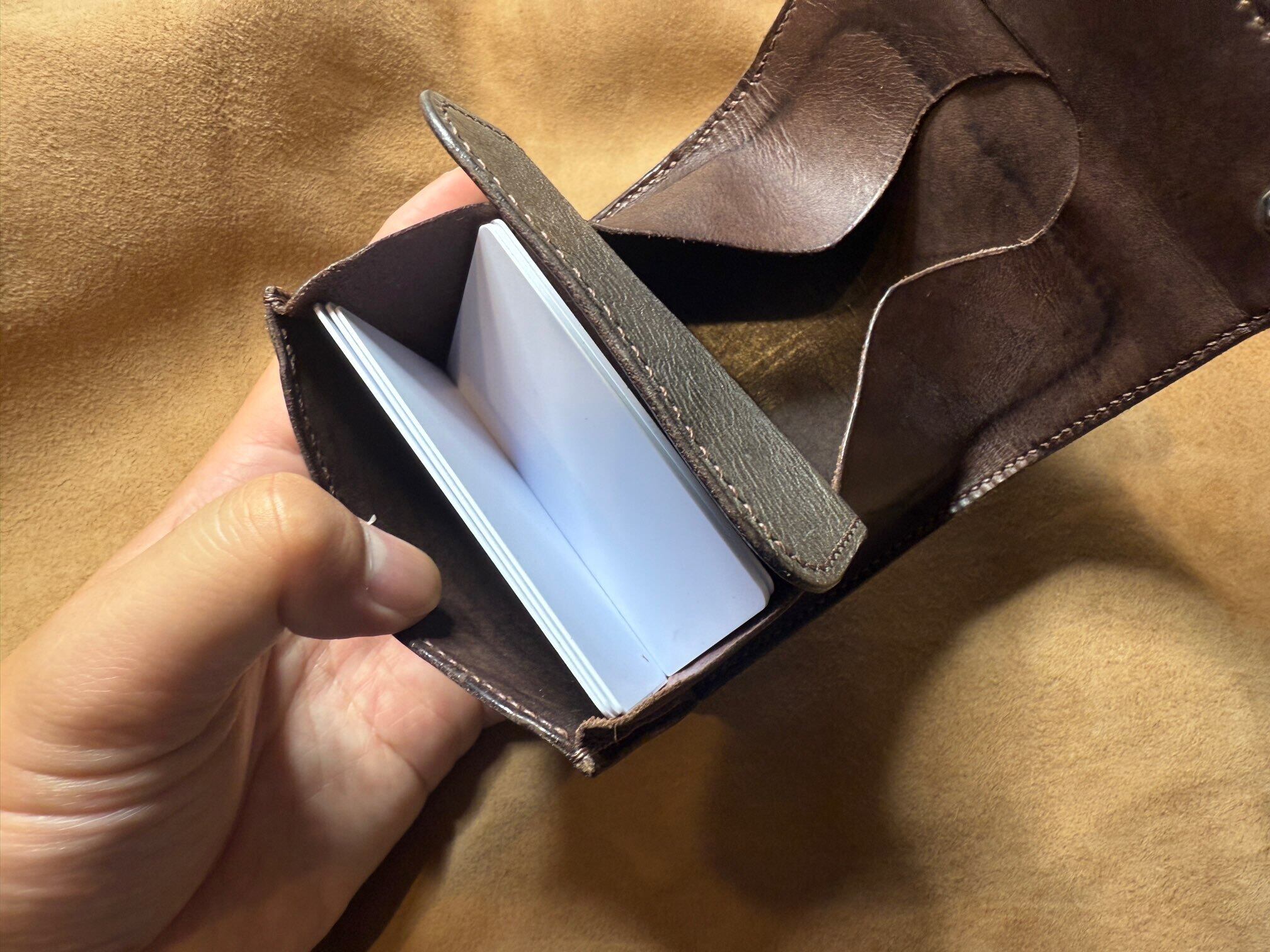 カードポケットは一枚一枚整理する構造ではなく、重ねていれて使用します。コイン室を開きやすいようにベロが取り付けてありますが、意味はそれだけではなく、伸ばしカード側面を覆うことで親指等をかけた際にカード側面で指の腹を傷つけないようにする保護の役割を思っています。それだけではなく、カードポケットの底はVの字になっているため、写真のようにカード8枚ほど入れた際は、カードの束の外側が上へ上がってしまい1番外側のカードの見せたくない文字等が他人の目に触れてしまう可能性があります。しかし、このベロがあることでブラインドの役割があります。