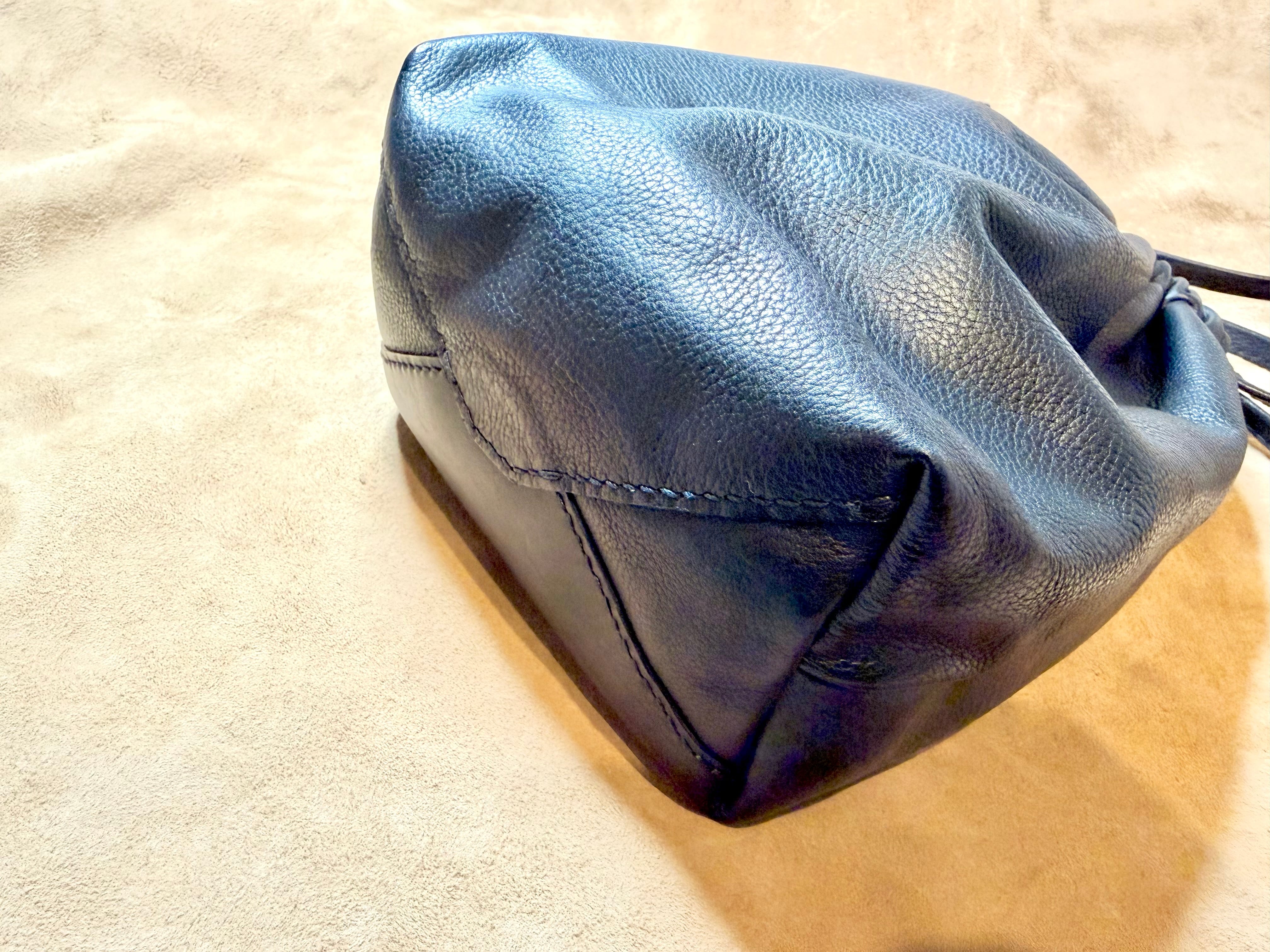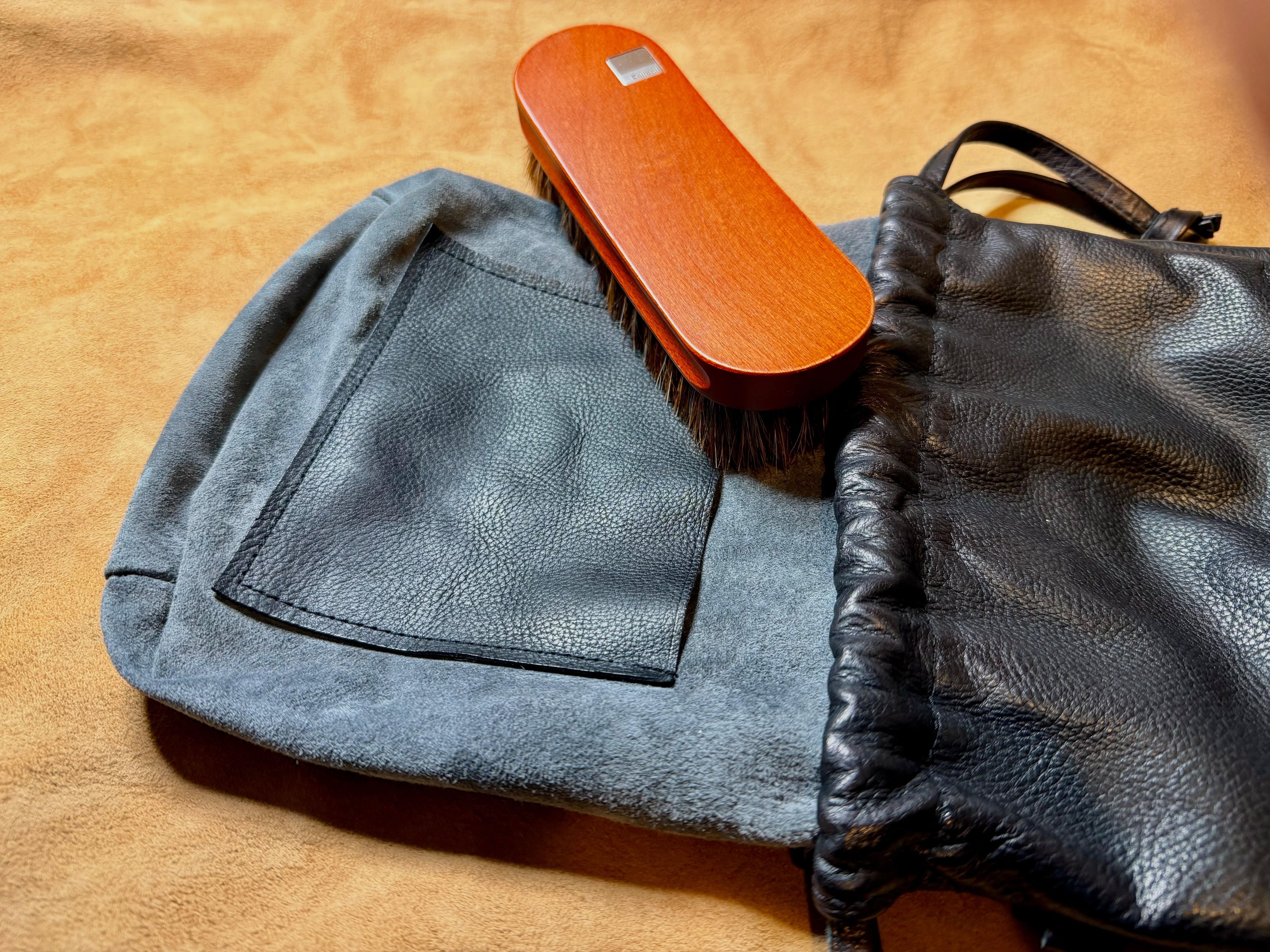 外装はブラックのシボありイタリアンレザー。新品のピカピカじゃなく、光をやわらかく受け止めるシボの陰影が、ホームの蛍光灯や夕暮れの街灯の下で静かに表情を変えます。内装はグレーのピッグスエードで、口を開けた瞬間に覗く淡いトーンが、無骨さの中に“余韻”を残す組み合わせ。きれいめにもアメカジにも寄り添いながら、どこかヴィンテージの気配を足してくれます。