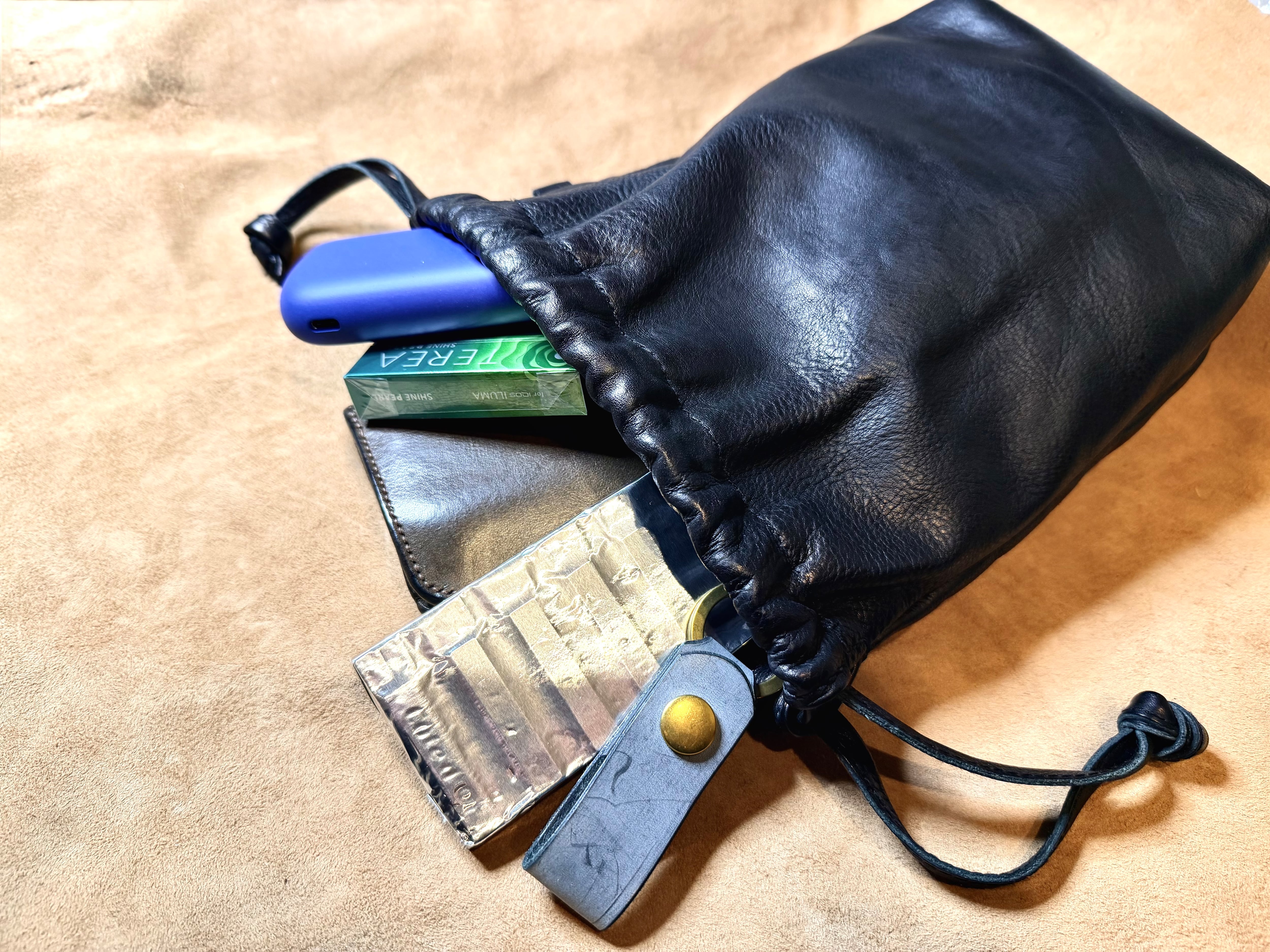 雨上がりの駅前。アスファルトがまだ少しだけ光っていて、改札を抜けるとコーヒーの匂いがする。古本屋の店先で文庫本を一冊、喫茶店でページをめくる——そんな“ゆっくりした街歩き”に似合う、受注生産のレザー巾着 hang out です。名前の通り「ぶらぶらする」気軽さを、そのまま道具にしました。