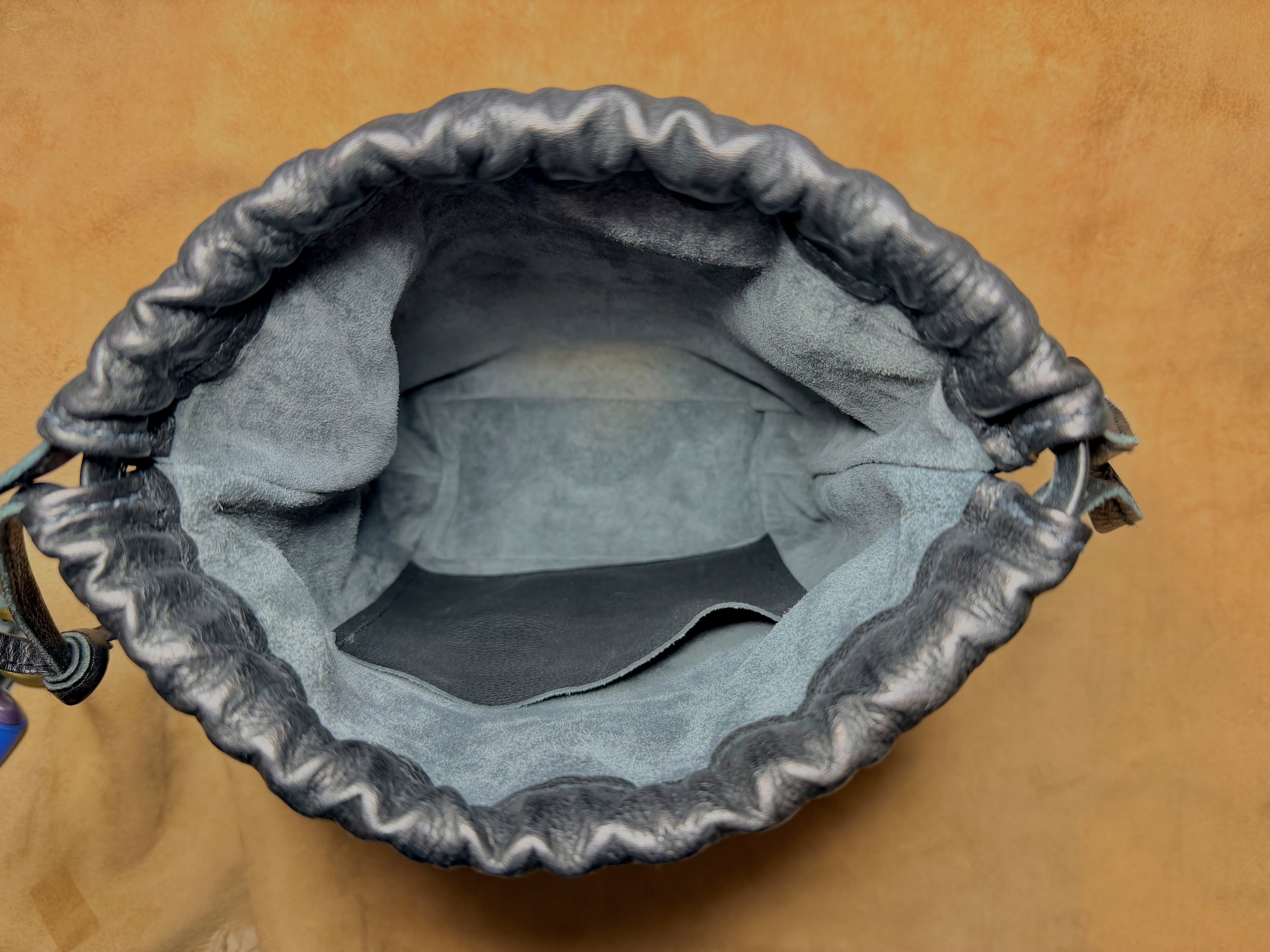 紐も外装と同じイタリアンレザーで製作。端は玉結びだけのミニマルな仕上げで、指に挟んでぶら下げるのも、握り込んで歩くのも自由です。内装スエードは引き出せるため掃除もしやすく、日常と小さな旅を行き来しても、ちゃんと付き合っていける作り。側面の耳には釣り針型フック等を付けられるので、キーホルダーや小物で自分の“街歩き仕様”に育てていけます。